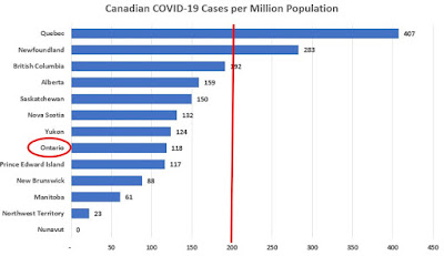 However, in my defense, I had also been saying Ontario's numbers might be somewhat low, as it was trying to clear a backlog of un-analyzed tests. And Ontario also has had a low testing rate. Could those be contributing to Ontario's perceived low infection rate.